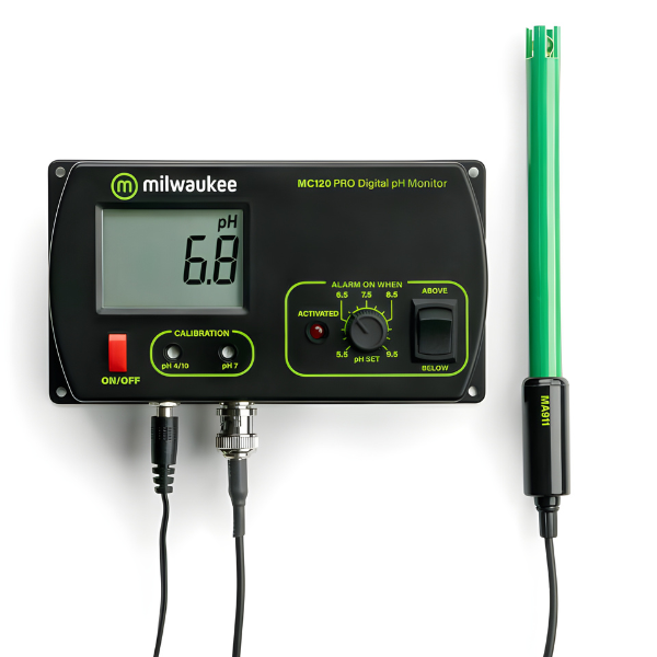 Funcionamiento: MC110 Conecta el transformador 12VDC a la corriente. Conecta el electrodo a la base del medidor Retira la protección de la sonda antes de cualquier medición. En el caso de que el electrodo se haya quedado seco, sumérgelo (2,5cm) en agua desmineralizada (M10000B) unos minutos para reactivarlo. Asegúrate que el medidor fue calibrado antes de uso. Sumerge el electrodo de pH (2.5 cm) en el liquido facilitado. Enciende el medidor de PH MC110 presionando el botón ON/OFF Elije el modo de control de PH (para PH > a punto de consigna : presionar “above” / Para pH < a punto de consigna : presionar “below”) Permitir que la lectura se estabilice y el medidor comenzará un seguimiento continuo. Una alarma visual indica el momento que la medición supera el punto de consigna. El punto de consigna puede ser seleccionado mediante el ajuste del mando de frente central en el valor deseado. El escalado de selección va de 3,5 hasta 7,5pH Calibración : Retira la protección del electrodo. Sumerge el electrodo en un sobre de liquido de calibración pH7.01 y espera a que el dato se estabilice.